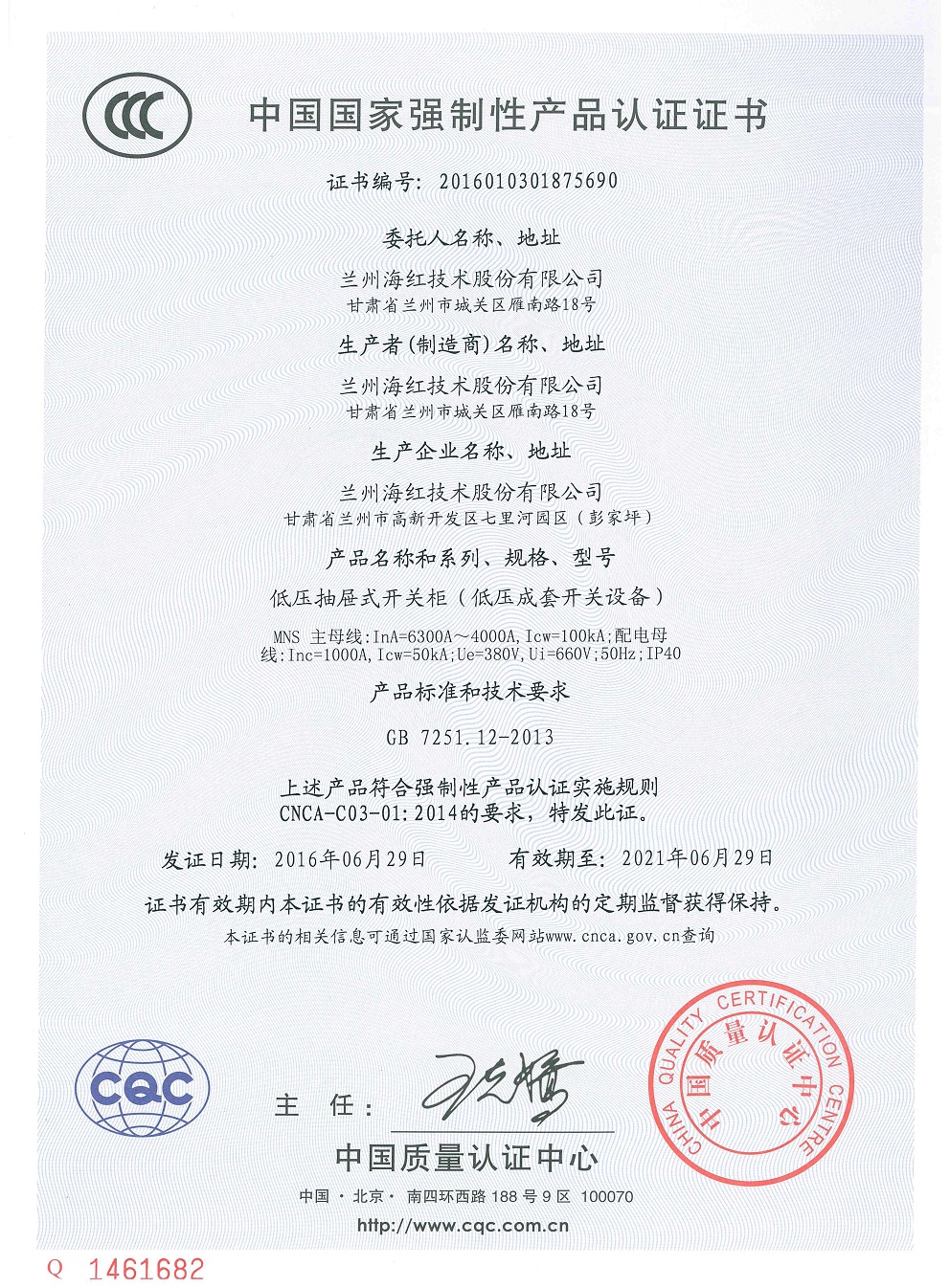 我公司的“低压抽屉式开关柜(低压成套开关设备)MNS(6300A-4000A)”通过国家CCC产品认证并取得证书