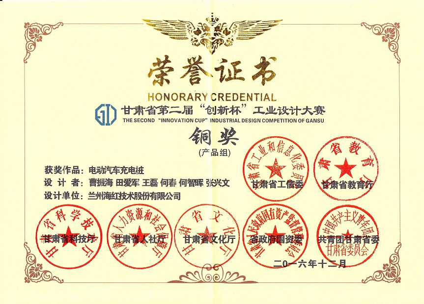 我公司“电动汽车充电桩”产品荣获甘肃省第二届“创新杯”工业设计大赛(产品组)铜奖