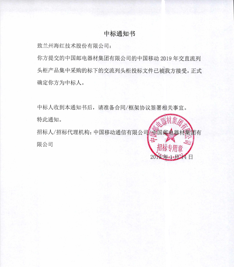 我公司成功中标“中国移动2019年交直流列头柜”