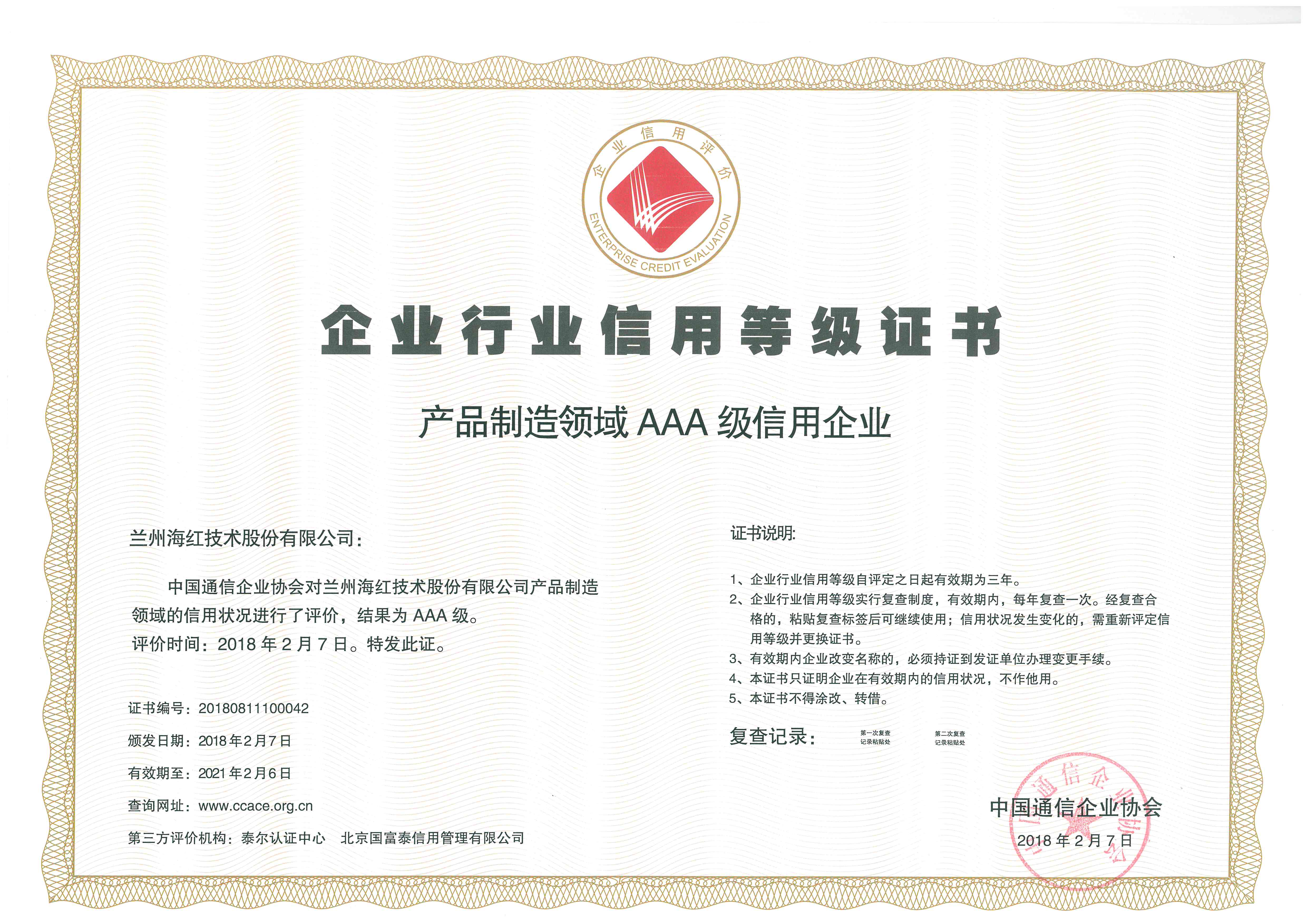 我公司被中国通信企业协会评价为“产品制造领域AAA级信用企业”,取得企业行业信用等级证书。