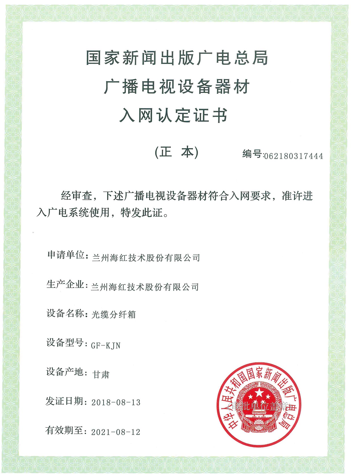 我公司的“光缆分纤箱(GF-KJN)、光纤配线架(GPX-01)、光缆交接箱(GFX-01)、综合布线柜(HJG-Z03)”产品取得国家新闻出版广电总局广播电视设备器材入网认定证书...
