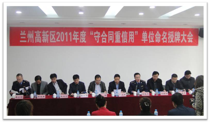 会议当天,兰州高新区主要领导对所有“守合同、重信用”企业进行授牌。我公司行政人资中心总经理焦旭丽作为3家企业代表之一,在现场做了守重工作汇报及交流。高新区管委会主任李虎林在会议上强调,企业信用建设是一项长期的工作,任重道远,要坚持以科学发展观为指导,踏实工作,开拓创新,切实加强企业信用体系建设,为把兰州高新区建成促进全市经济社会率先跨越发展的重要战略支点做出新的贡献。